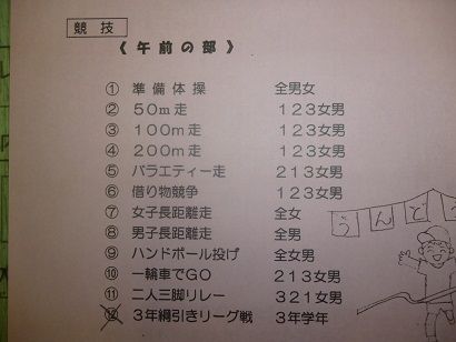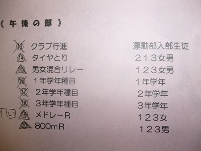 番号14のタイヤとり、番号15の男女混合リレー、番号19のメドレーR、番号20の800mRつきましては、本日の進行具合でできるところまで実施いたします。終了予定は午後4時と考えています。