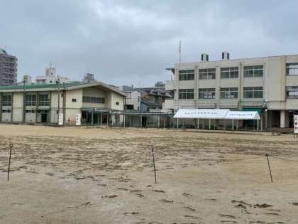 午後5時現在、運動場の状態です。開催にむけて、一日水溜まりをスポンジで吸いとりました。