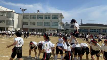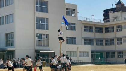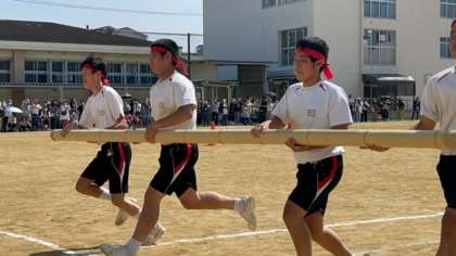 台風の目、いかだ渡し、棒登りを取り入れた学年種目。