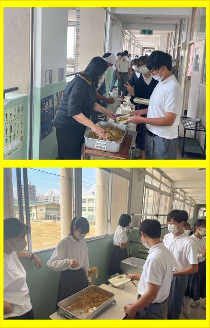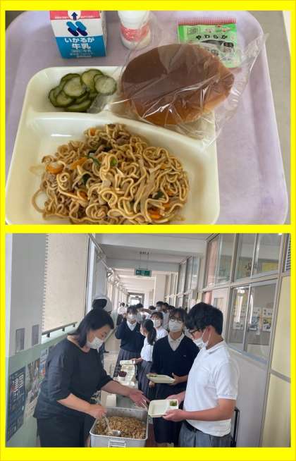 メニューは、「オイスターソース焼きそば」・「きゅうりのピリ辛あえ」・「ソフト黒豆」・「発酵乳」・「パン」・「牛乳」でした。
