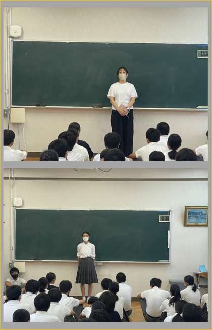 続いて、学級代表から「文化祭に向けてそれぞれの役割を果たしましょう。また、テストが続きますが、しっかりと対策をしていきましょう。」と話がありました。(担当:田中)