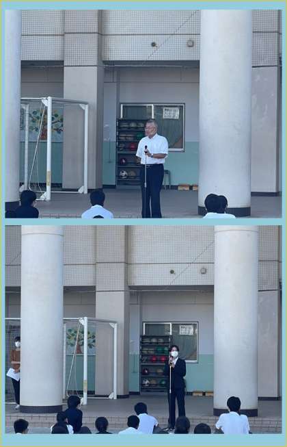 9月5日から2週間、教育実習として活動していた大阪成蹊大学教育学部3回生の伊藤盟理さんが本日が最終日となるので、全校生徒にむけて挨拶をされました。