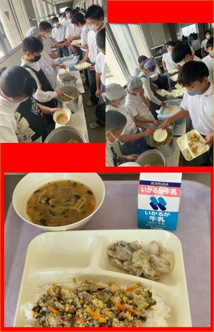 本日の給食メニューは、「他人丼」・「とうがんのみそ汁」・「キャベツの赤じそあえ」・「牛乳」でした。