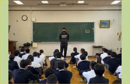 「先日の文化祭では、学年合唱、クラス合唱、1年生全体が力を合わせ、成功させることができました。この経験を活かして、今日の校外学習の買い出しや、明日の登山、飯盒炊爨なども協力をし、たくさんのことにチャレンジし、成功させましょう」とお話がありました。(担当:水田)
