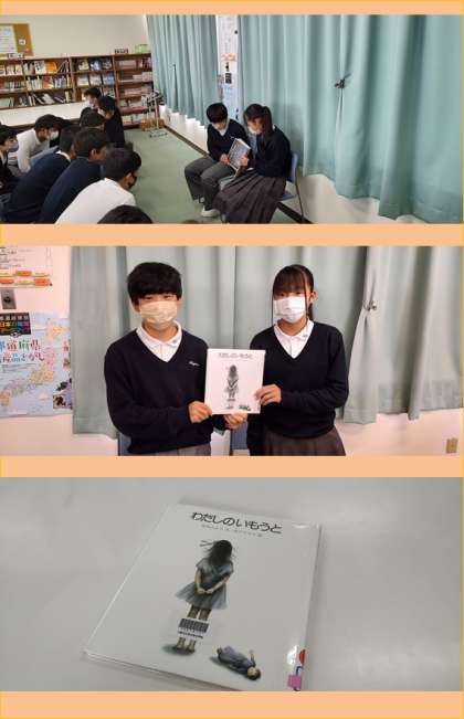 今日は、1年2組の文化委員が読み聞かせしてくれました。本のタイトルは松谷みよ子さんの「わたしのいもうと」です。それまでざわついていた室内が、文化委員の「この本の内容は実話です」という言葉で静まり、本の世界に引き込まれました。