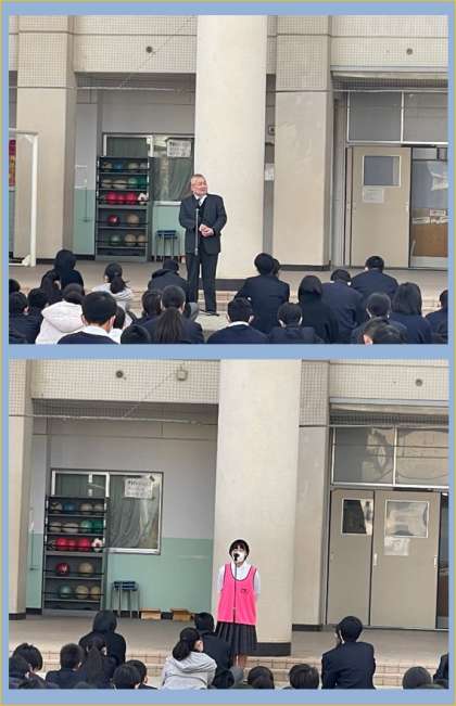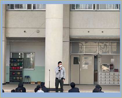 サッカーワールドカップ決勝トーナメントの話題で持ちきりです。勝ち進むには準備や計画、どうすれば勝てるかを考えたと思います。君たち1、2年生も年明けてすぐチャレンジテストがあります。あと1か月後です。目標を立てて準備期間をもうけ、計画して粘り強く取り組んでください。
