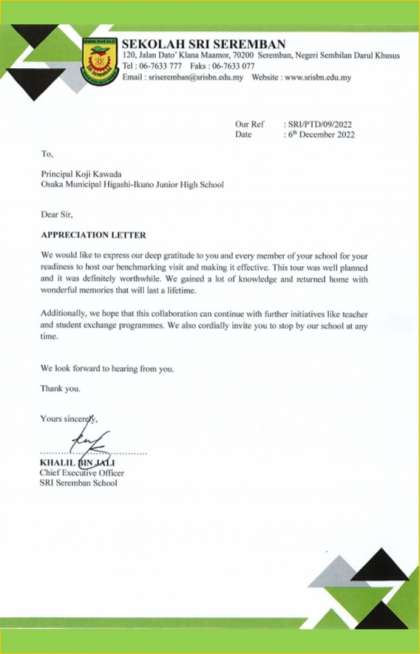 11月30日にマレーシアSRIスレンバンスクールの教員団が本校に訪問されました。その感謝状が届きました。