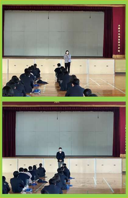 上井先生から「今年度に初めて、東生野中学校に来ましたがみんな素直で笑顔溢れる学校だと思いました。第一印象はすごく大事です。見た目で皆さんの印象が決まります。普段から服装や言葉づかいなどを意識していきましょう。みんなの良い部分は更に磨き、足りないと思う部分は、気づいて改善していきましょう。」と話がありました。