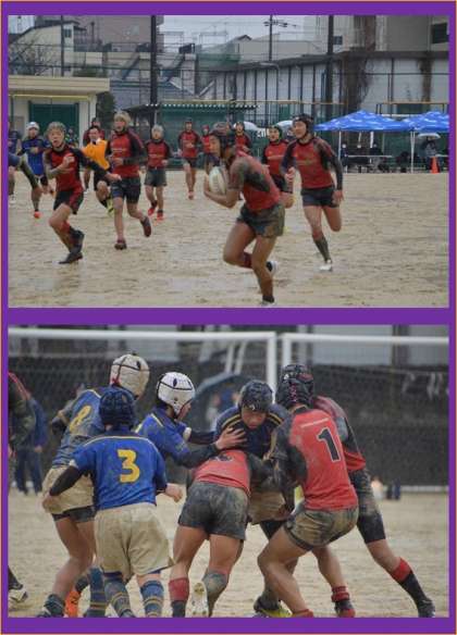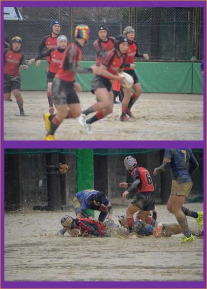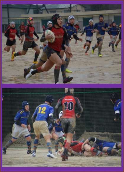 昨日からの雨で、グランド状態は悪かったですが、新チーム初めての公式戦とあって、メンバーは気合十分。前半7トライ3ゴール、後半3トライ3ゴールの62点を入れ、守っては0点で抑え、62対0で勝利しました。