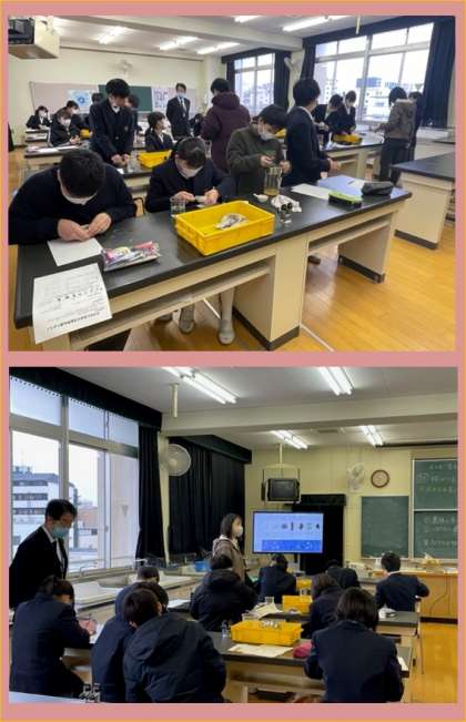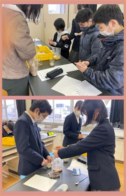 本時の内容は、土の中に含まれる鉱物をを調べる実験でした。生徒どうしでコミュニケーションをとりながら、協力して実験を進められました。