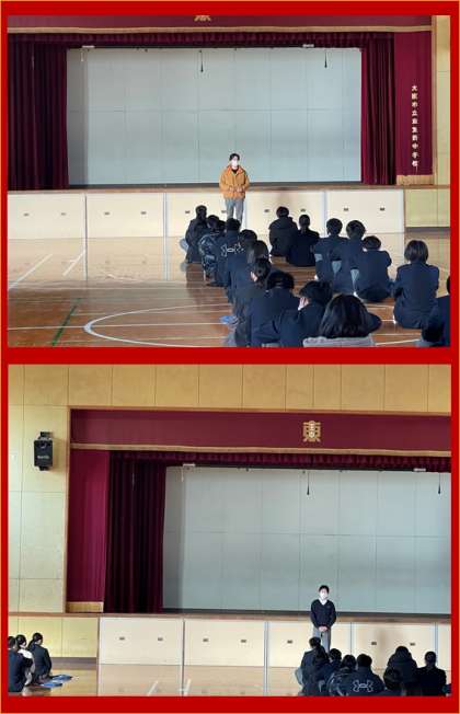 学年主任の石原先生より「私学受験が終わり、受験を終えた人がいます。来週は、特別選抜、来月は一般選抜と受験が残っている人もいます。みんなで、受験合格を勝ち取れるようにしましょう。また、修学旅行、運動会、文化祭、普段の学校生活とみんなと普段楽しい日々を過ごしてきました。卒業式まで残り、少なくなっています。有終の美を飾れるように、日々を大切にしていきましょう。」と話がありました。