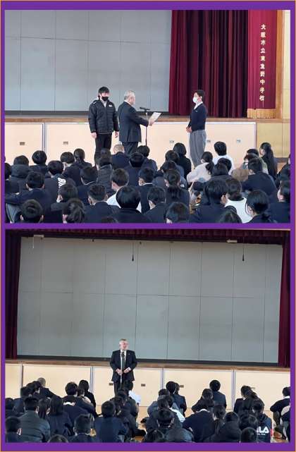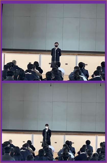 2、3月は曜日が同じなので、3月の今日は1、2年だけの生徒集会になります。今日、3年は特別選抜で9人がチャレンジしています。3年は残り少ない学校生活になりました。1、2年は明日から学年末テストです。3学期は期間が短く、あっという間に過ぎていきます。進級にあたって大切な準備期間です。普段の学習やクラブなどいろんな所で頑張ってほしいと思います。
