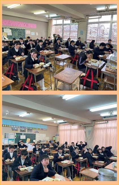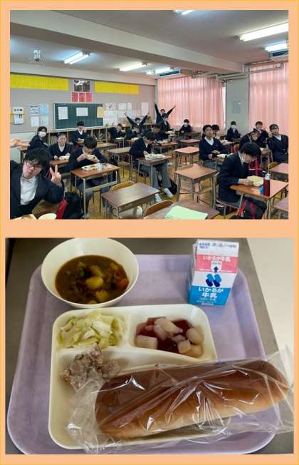 本日の給食メニューは、「フライドチキン」・「カレーシチュー(米粉)」・「キャベツとコーンのサラダ」・「フルーツゼリー」でした。