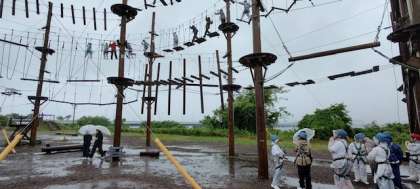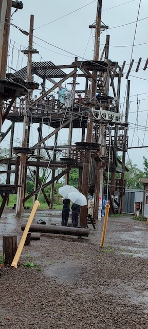スカイアドベンチャーに着きました。雨の中ですが、みんな一番高い所に挑戦しています。