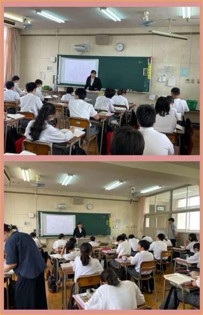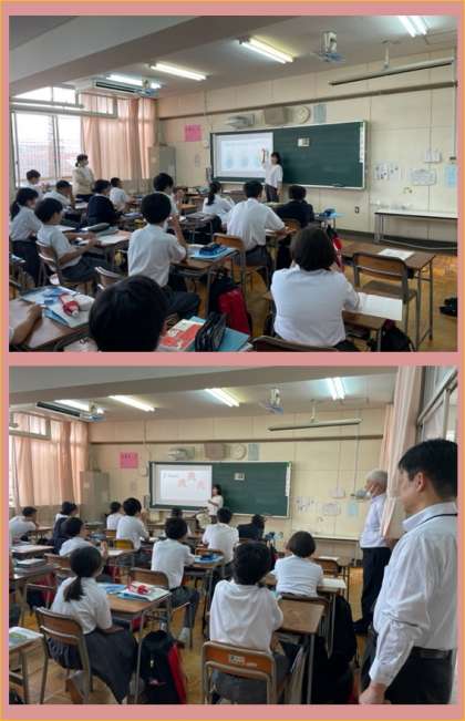(写真上:1組) 上井先生の英語です。大阪市教育センターから中西先生に来ていただき、後でご指導をいただきました。