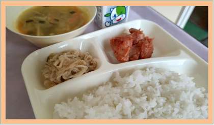 鶏肉のチリソース焼きと焼き豚とワンタンの皮のスープ、