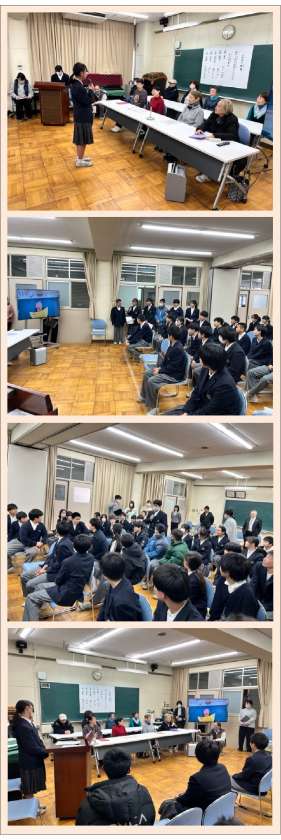 はじめに夜間学級の生徒さんの作文発表を聞きました。涙ぐみながら「勉強できて嬉しい。」「学校に来ることが幸せ。」と話されているのを聞いて、1年生の生徒は学びの大切さを肌で感じ取ることができました。