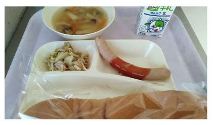今日の給食は、茹でたウインナーソーセージにケチャップ味のソースをかけています。
