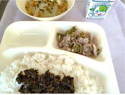 今日の給食の「つくだ煮のり」は砂糖、濃い口醤油、だし、しいたけと、かつおぶし、きざみのりを加えて煮つめて作っています。