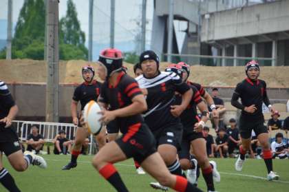 前半から速いテンポで仕掛けた本校は、前半3分、相手陣の相手ボールラインアウトを奪取、大きくBKに展開し先制トライを挙げ、さらにトライを挙げ、序盤で12−0とリードしました。