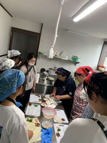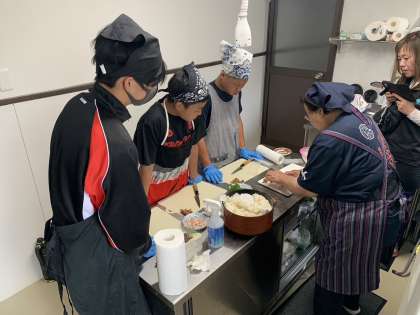 スタッフさんに教わりながら、へしこを使ったカナッペと寿司を作っています。