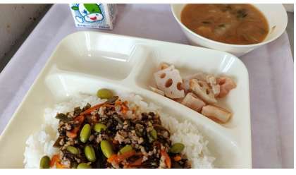 今日の給食では、「豚ひき肉、にんじん、むきえだまめ、もずく、切こんぶなどを使った炊き込みご飯風です。
