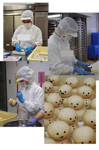 お菓子の箱詰め、雪だるまパンのお顔描き、クロワッサンの成形などの作業をしています。