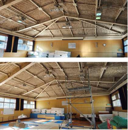 電気の昇降機が降りてこない部分もあり、足場を組んで取り替えています。
