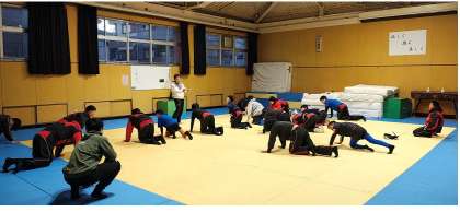 ラグビー部の生徒が、今日は体操部の先生からストレッチを教わっています。