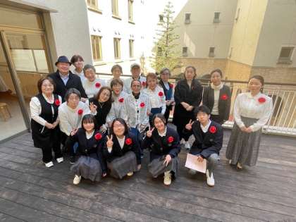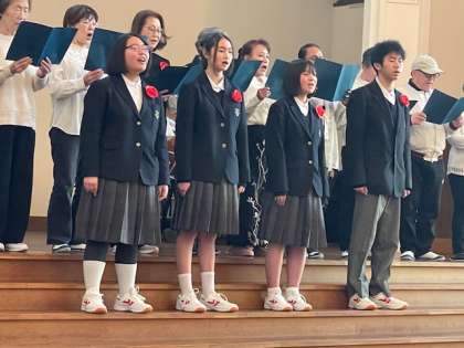 第12回いくのくスプリングコンサートが、プール学院内にある清心館で行われ、夜間学級の生徒さんたちとの合同で、『Sing』『百万本のバラ』『切手のないおくりもの』の三曲を披露しました。