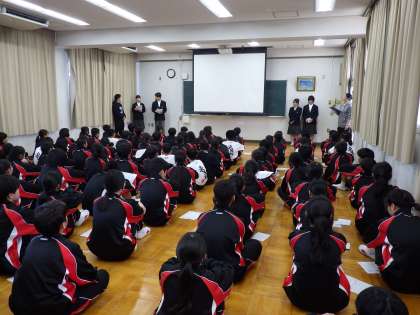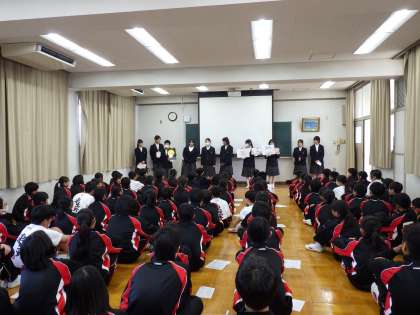 4月9日(水)1年生に向けて部活動紹介を行いました。生徒会、コーラス部、イラスト文芸部の様子です。1年生のみなさんは先輩の発表を真剣に見て、聞いていました。