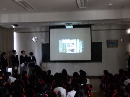 4月9日(水)1年生に向けて部活動紹介を行いました。男子バスケット部、ソフトテニス部、女子バスケット部の様子です。1年生のみなさんは先輩の発表を真剣に見て、聞いていました。多目的室での実施のため運動部は映像での紹介となりました。
