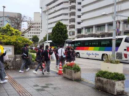 4月13月(日)修学旅行最後のプログラム、国際通りでの活動を終えて空港に向かいます。気温17℃、。バス乗車前に雨が降ってきました。