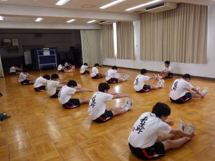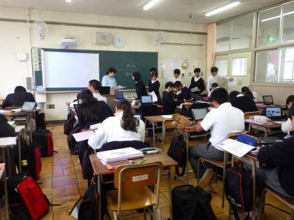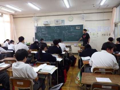 5月2日(金)お昼を迎え雨も上がり日が差してきました。2年生の授業の様子です。1組数学、2組英語、3組男子の体育、体育は多目的室で行っています。