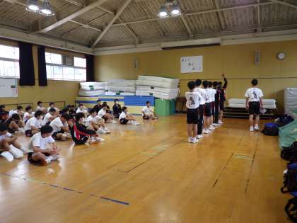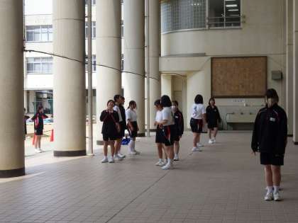 5月12日(月)3年生の体育の授業の様子です。男子は格技室で集団行動、女子は職員室前で授業をしています。