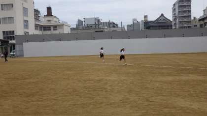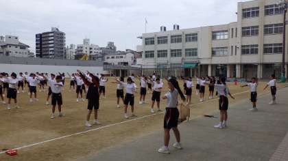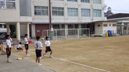 6月9日(月)梅雨入り前の月曜日、子どもたちは元気に頑張っています。1年生の体育、スポーツテストのハンドボール投げと50m走を行っています。