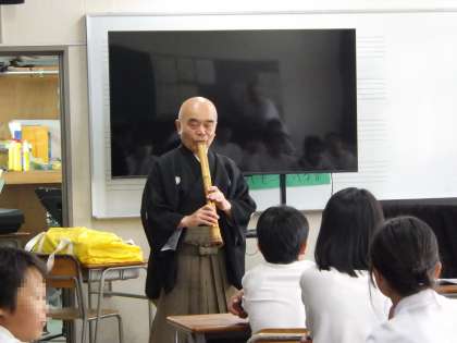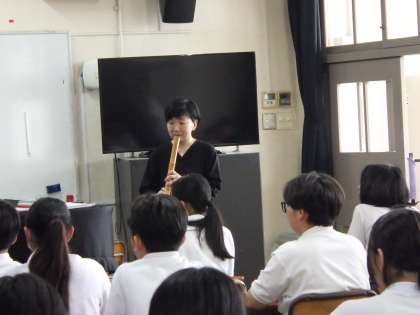 7月3日(木)1年生の音楽での出前授業です。講師の先生にご来校頂き尺八についての学習です。