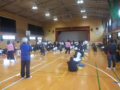 運動場で全体練習を予定していましたが、あいにくの雨のため急遽体育館で招集の練習をしました。