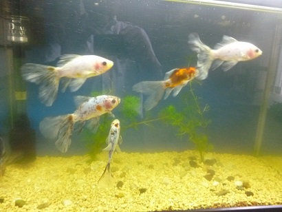 玄関においている水槽で金魚が悠々と泳いでいます。
