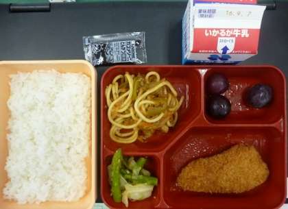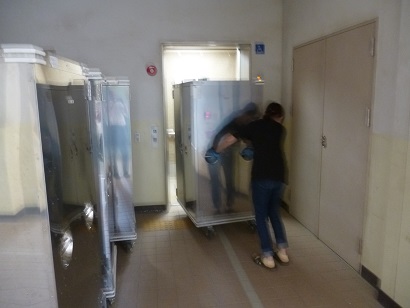 配送されてきた給食を温蔵庫・冷蔵庫に一旦入れ、その後学年・組ごとにコンテナに詰め替え、3階の1・2年生、2階の3年生の階までエレベーターを使って運んでくれています。 感謝!