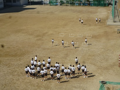 爽やかな秋空の下、1年生の体育の授業でハードルが行われています。