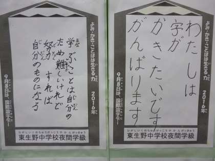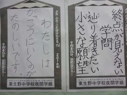 会議室では夜間学級の生徒(平均年齢68.5歳)さんたちの作品が展示されています。