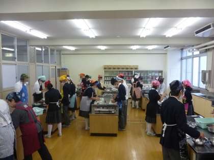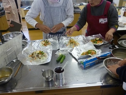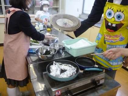「鮭のホイル焼き」「ワカメときゅうりの酢の物」「みたらし団子」の3点を、班ごとにチームワークで調理しています。