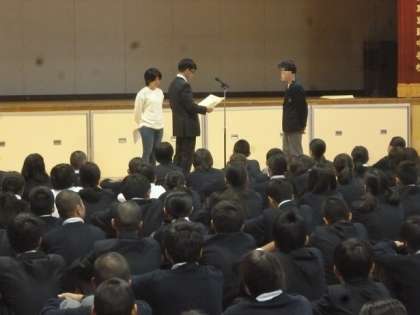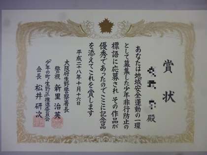 大阪府生野警察署と「少年の町・生野区」推進委員会の方より、標語作品が優秀であったことから、賞状と記念品(図書カード)をいただいました。おめでとう!