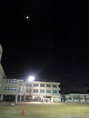三日月のもと、サッカー部は夜間照明を点けて練習しています。