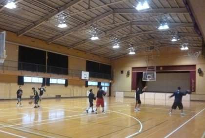 体育館では、朝から男子バスケットボール部が練習しています。