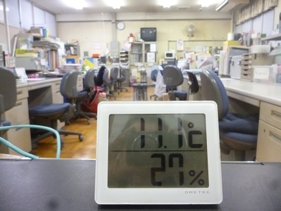 朝7時現在。雪雲が覆う冬空のもと、外気温は摂氏1.5度、室温は摂氏11.1度でした。
