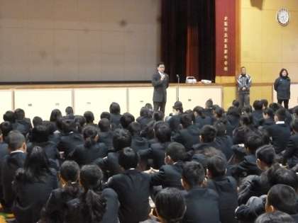 「42年ぶりに広島にある高校の同窓会に出席しました。その中でも同じ中学校出身者が集まり、中学校時代の思い出話に花が咲き、あっという間に3時間が過ぎ去りました。本当に楽しいひと時でした。いくつになっても当時は思い出されるものです。3年生も東生野中学校で仲間と過ごした思い出を整理しておきましょう!」と卒業に向けての話をされました。