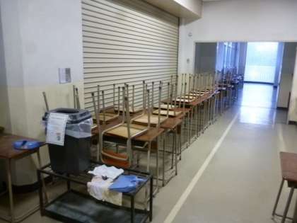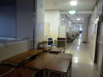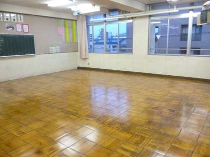 教室の中の机などを全部廊下に出しきり、ワックスがけです。