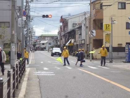 毎朝、登校時に地域の見守り隊の方々が、児童・生徒の登校を体を張って見守ってくださっています。